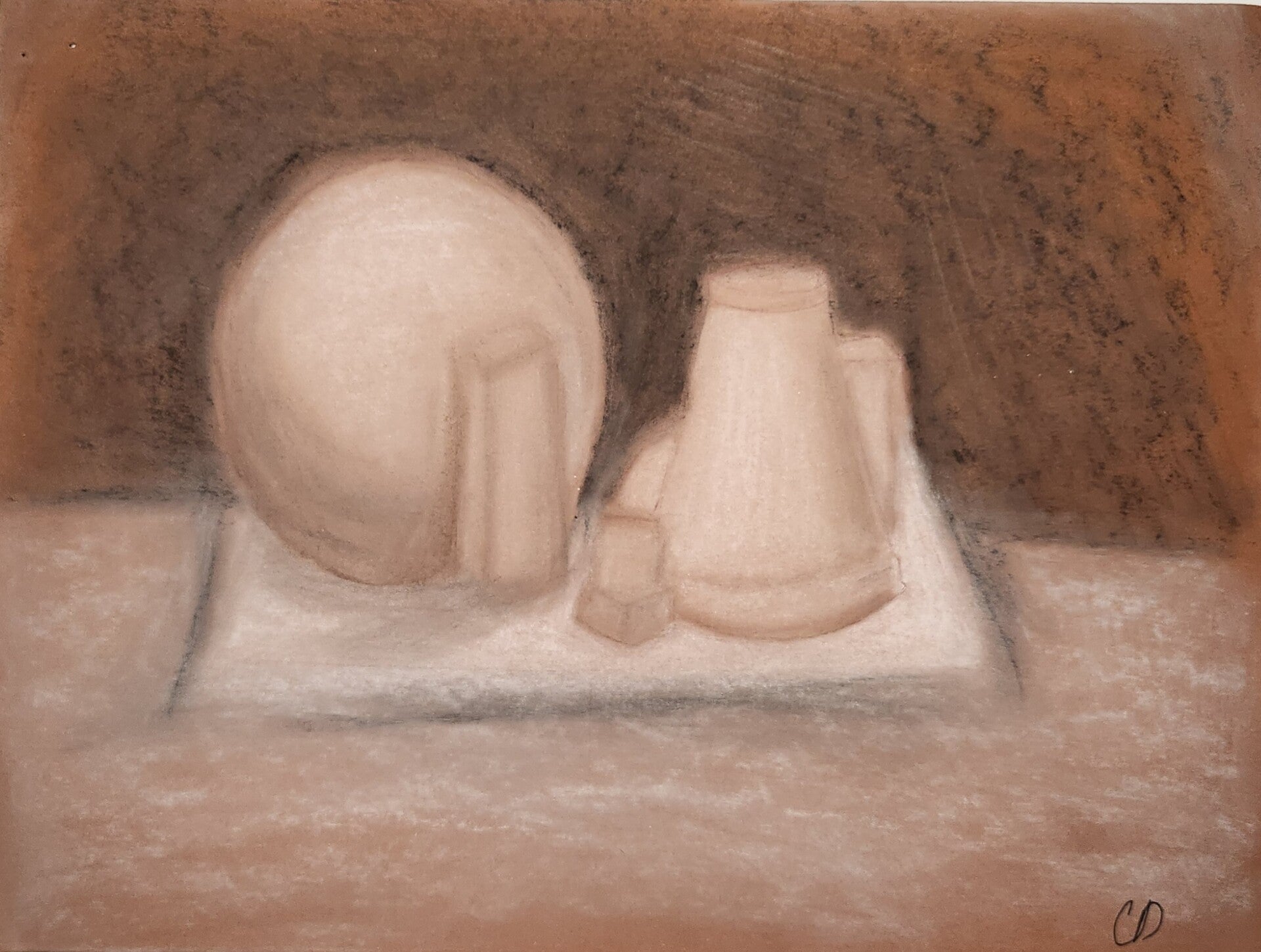 This is a sketch made with brown, white and black conte. To create this piece I set random shapes on a small piece of card board. My goal with this sketch was to replicate the 3D look by capturing the lighting and shadows.